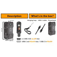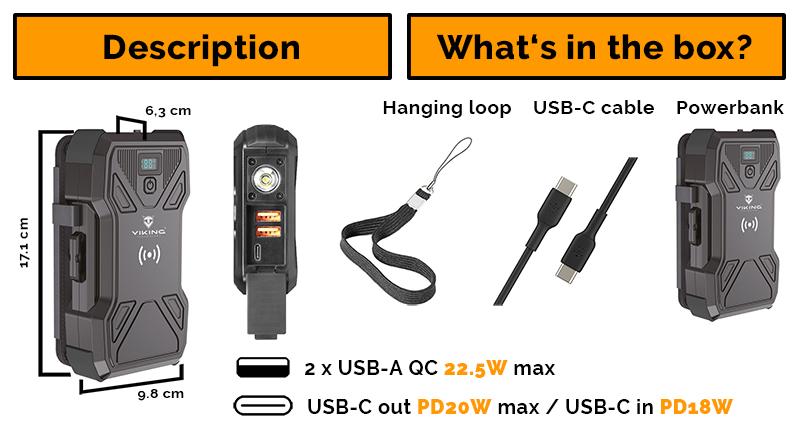 Viking TYR III je vybavený modernými technológiami nabíjania. Vďaka výstupu USB-C a dvom výstupom USB-A môžete nabíjať svoje zariadenia rýchlosťou až 22,5 W. Dokonca aj samotnú power banku môžete rýchlo nabíjať pomocou vstupu USB-C (PD18W max.).